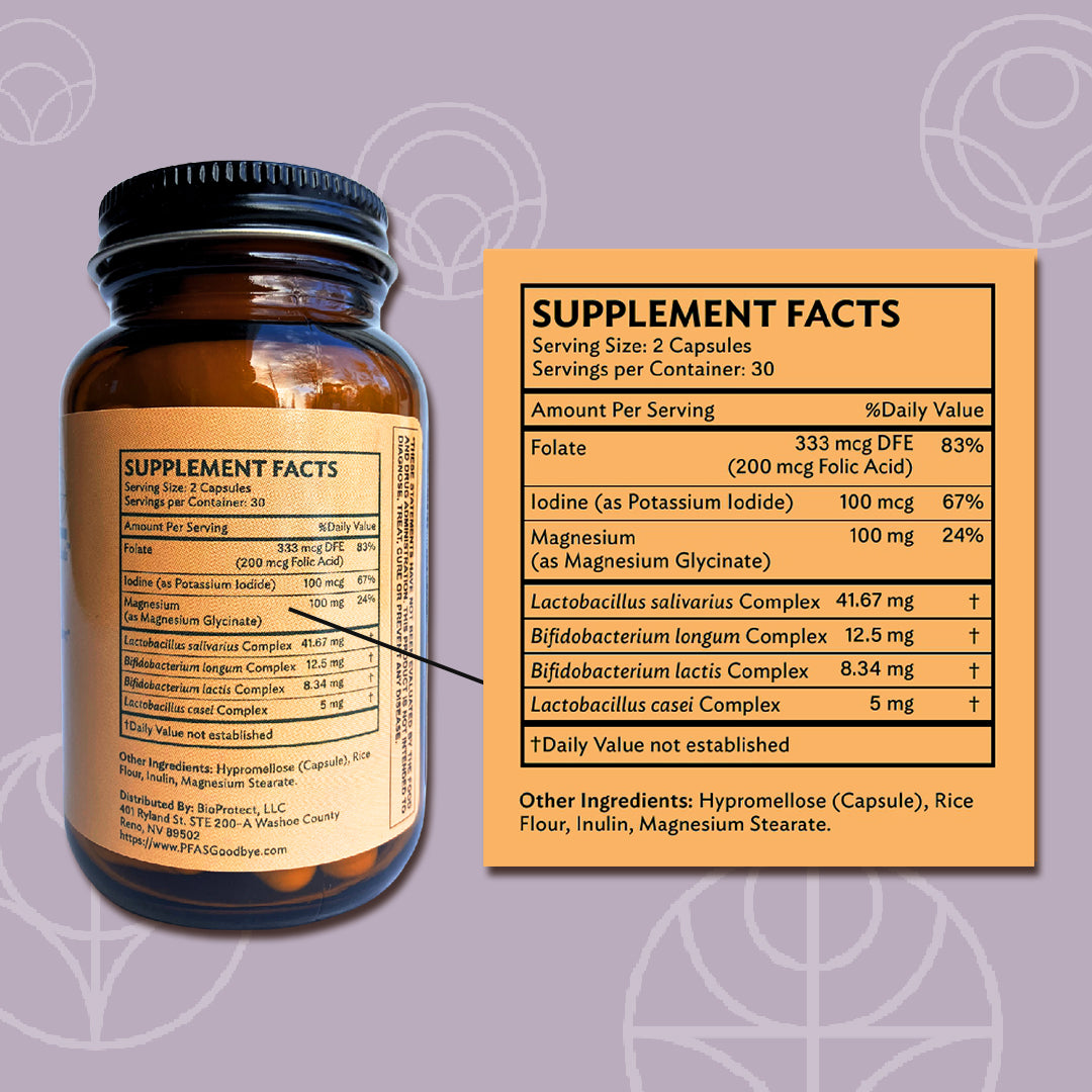 Our PureFertility supplement features a Proprietary Probiotic Blend to support PFAS excretion. Key ingredients also include Folate for fertility and PFAS reduction, Potassium Iodine for thyroid support, and Magnesum for detoxifcation and hormonal balance.